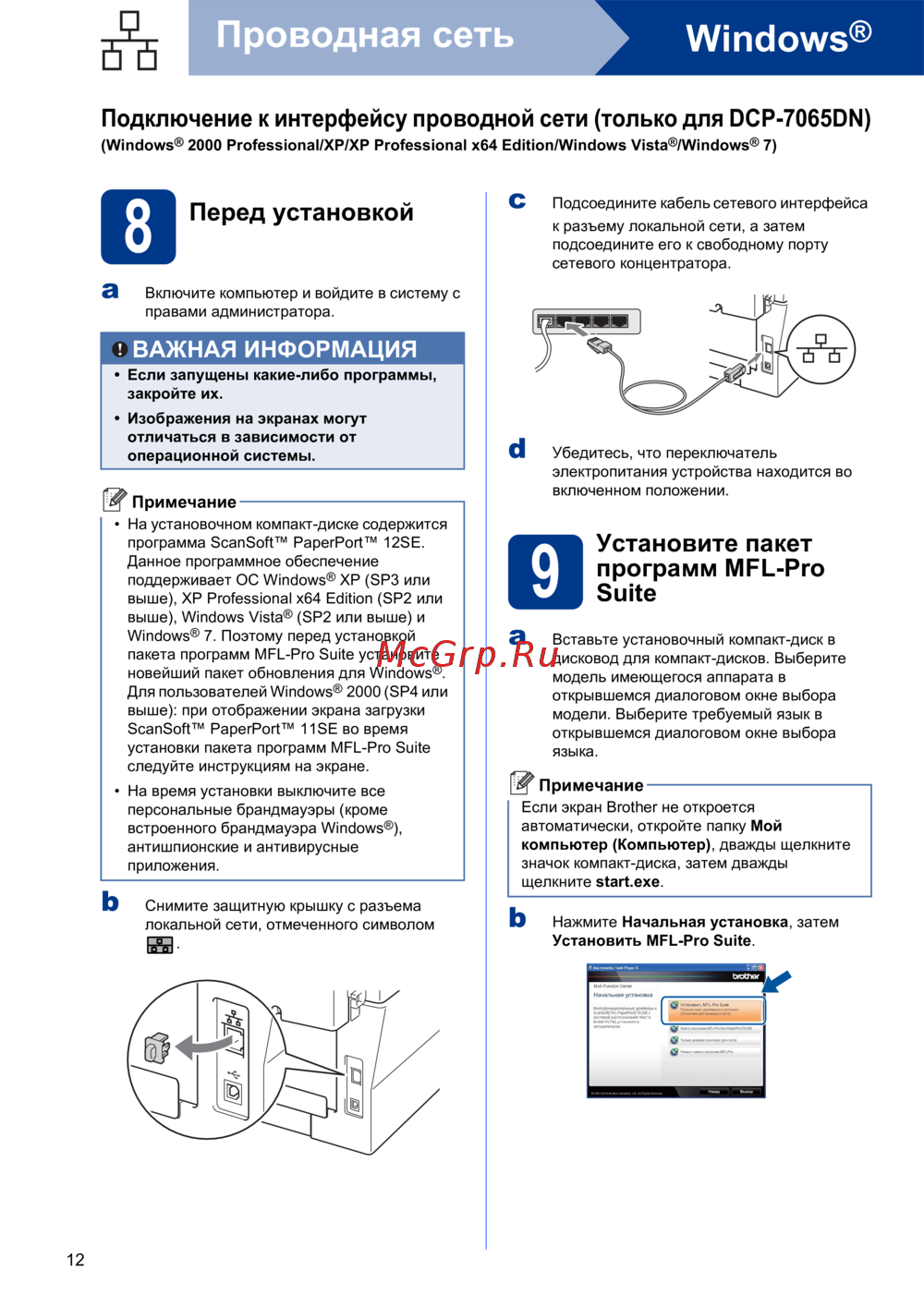 - Подключение к интерфейсу проводной сети только для dcp 7065dn windows 2000 professional xp xp professional x64 edition windows vista windows 7 p.12