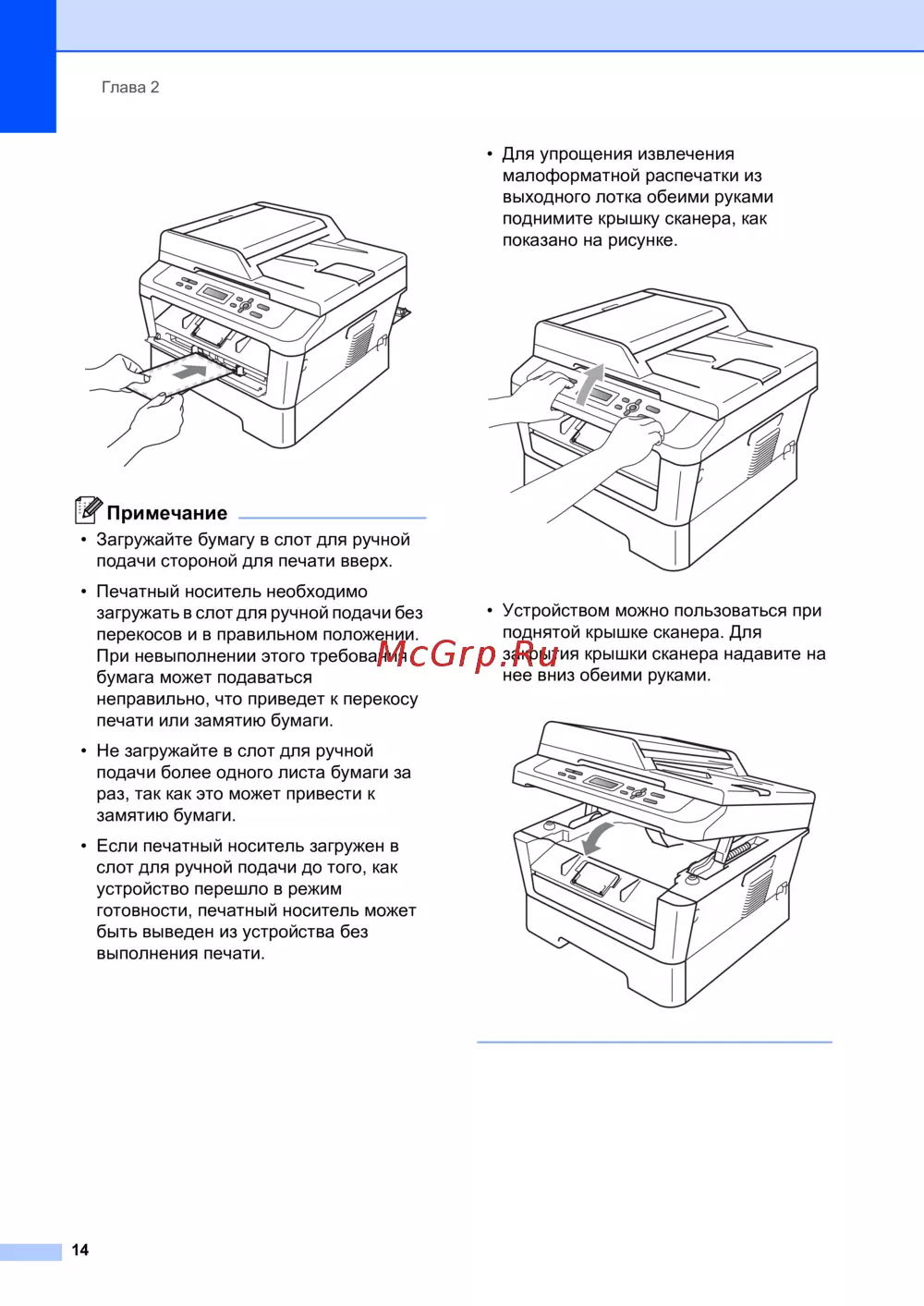 - Устройство загружает бумагу из установленного стандартного лотка для бумаги или из слота для ручной подачи p.25