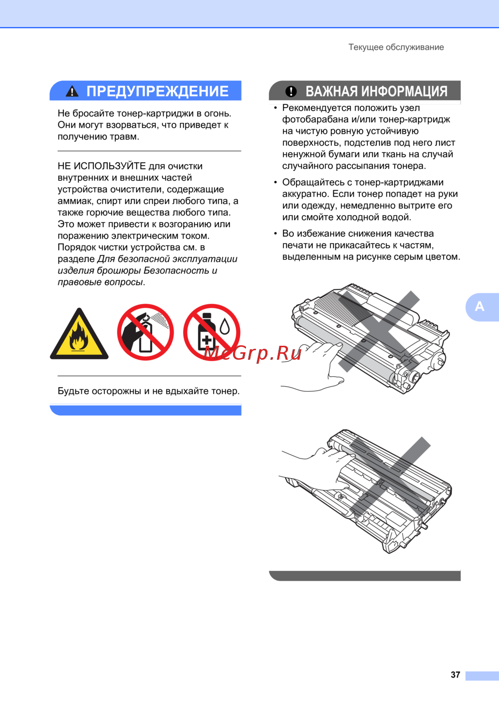 Не бросайте тонер-картриджи в огонь.