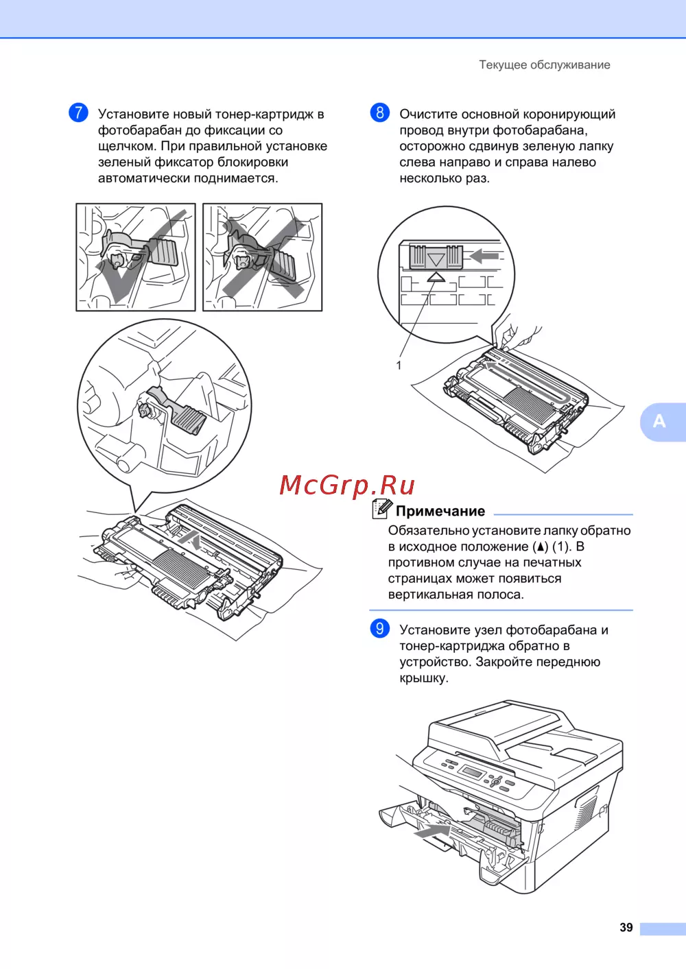 g Установите новый тонер-картридж в