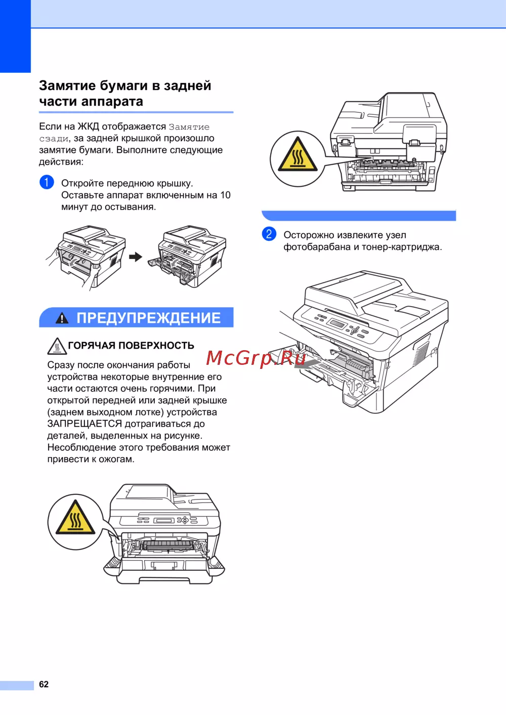 Узнайте, как правильно устранить замятие бумаги в задней части аппарата. Следуйте простым шагам для безопасного извлечения узлов и предотвращения ожогов.