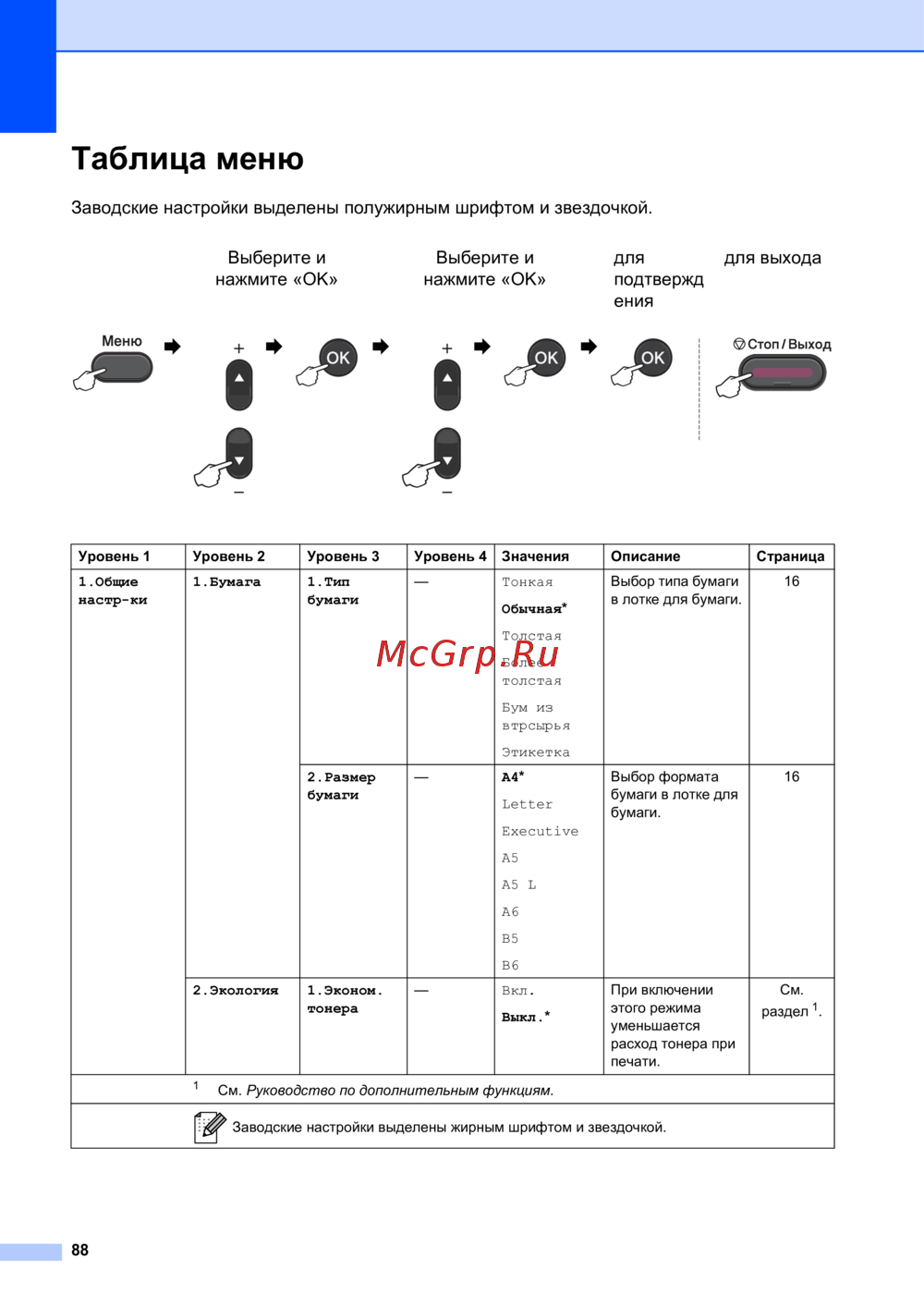 Заводские настройки выделены жирным шрифтом и звездочкой.
