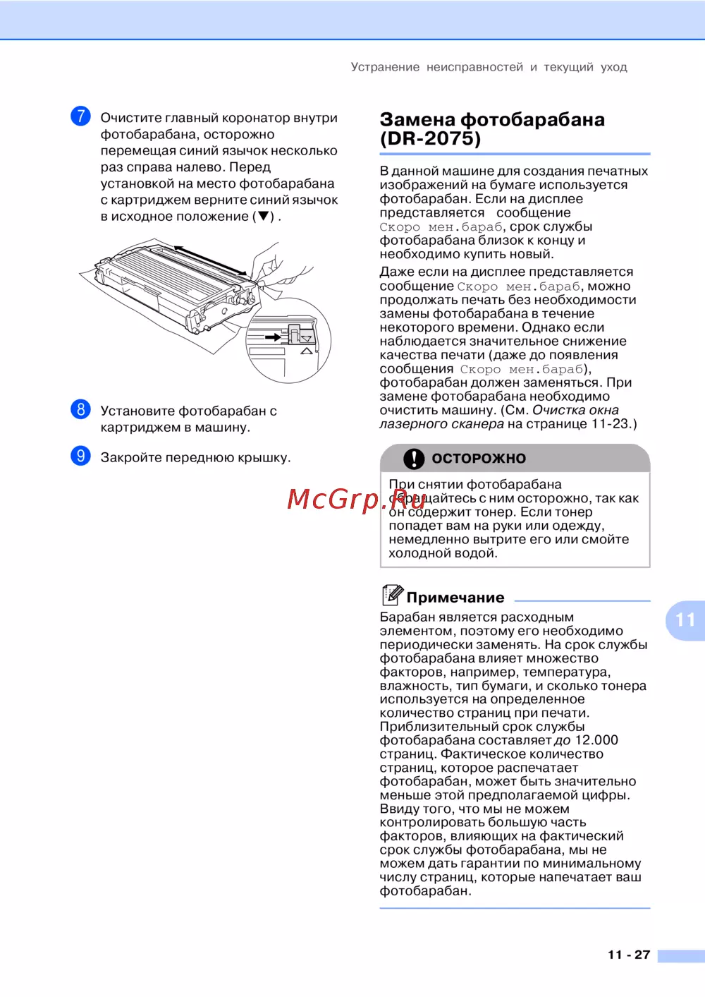 - На срок службы фотобарабана влияет множество факторов например температура влажность тип бумаги используемый тонер и количество страниц при печати p.138