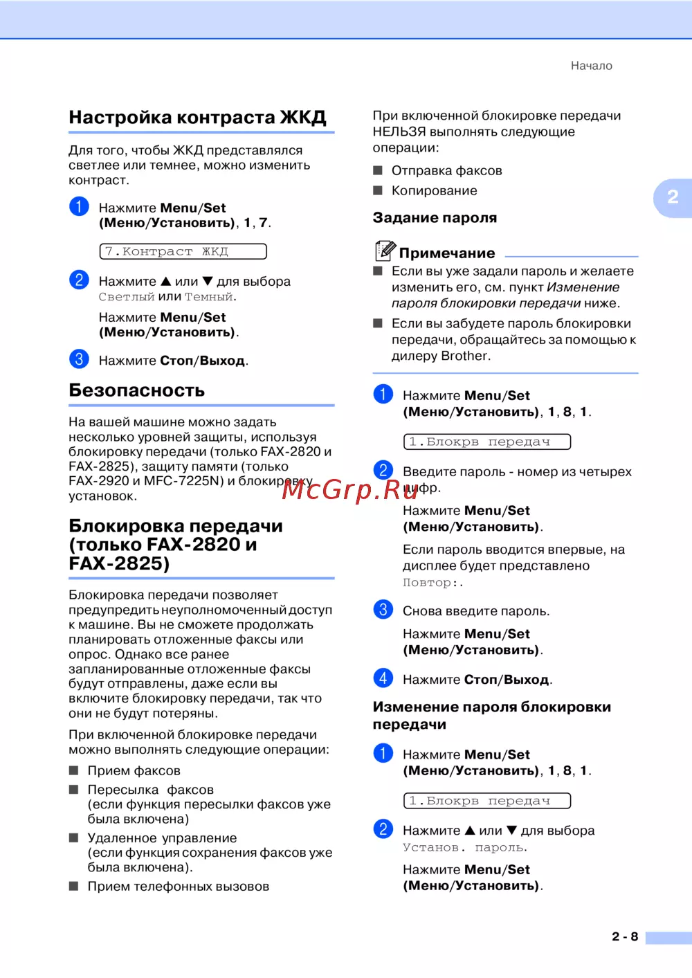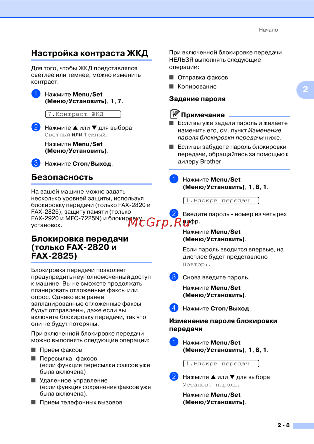 Brother FAX 2825 — настройка контраста и безопасности на ЖКД устройствах [34/147]