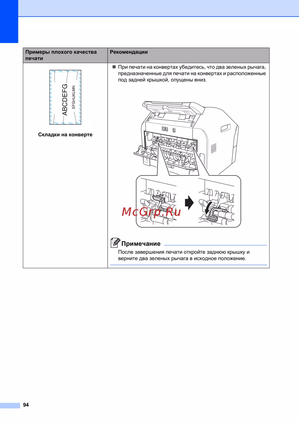 При печати на конвертах убедитесь, что два зеленых рычага,