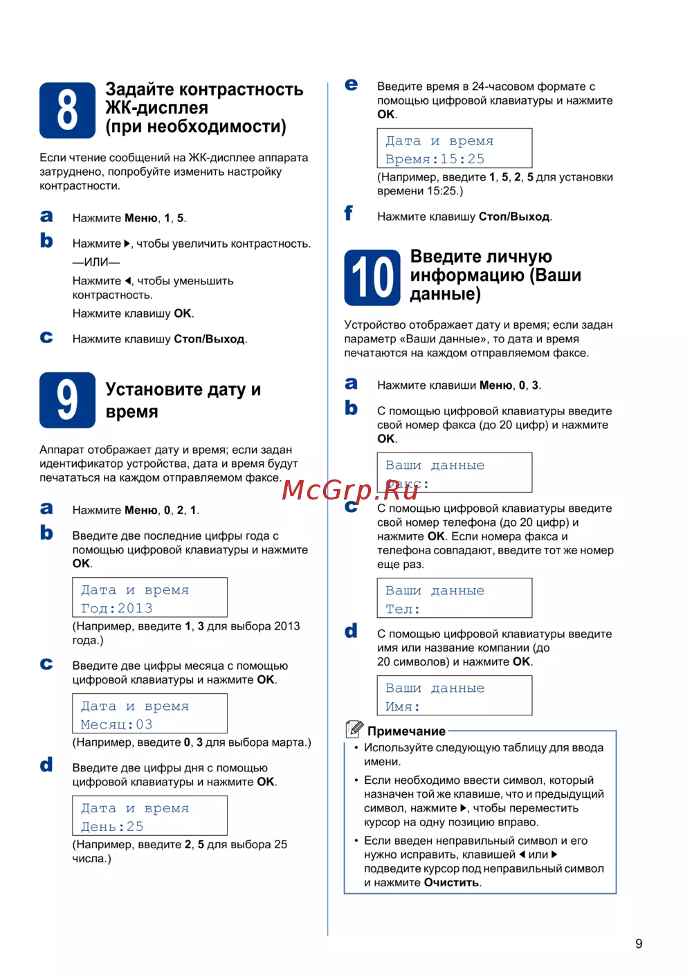 Brother FAX-2840 — настройка ЖК-дисплея и ввод личной информации устройства [9/14]