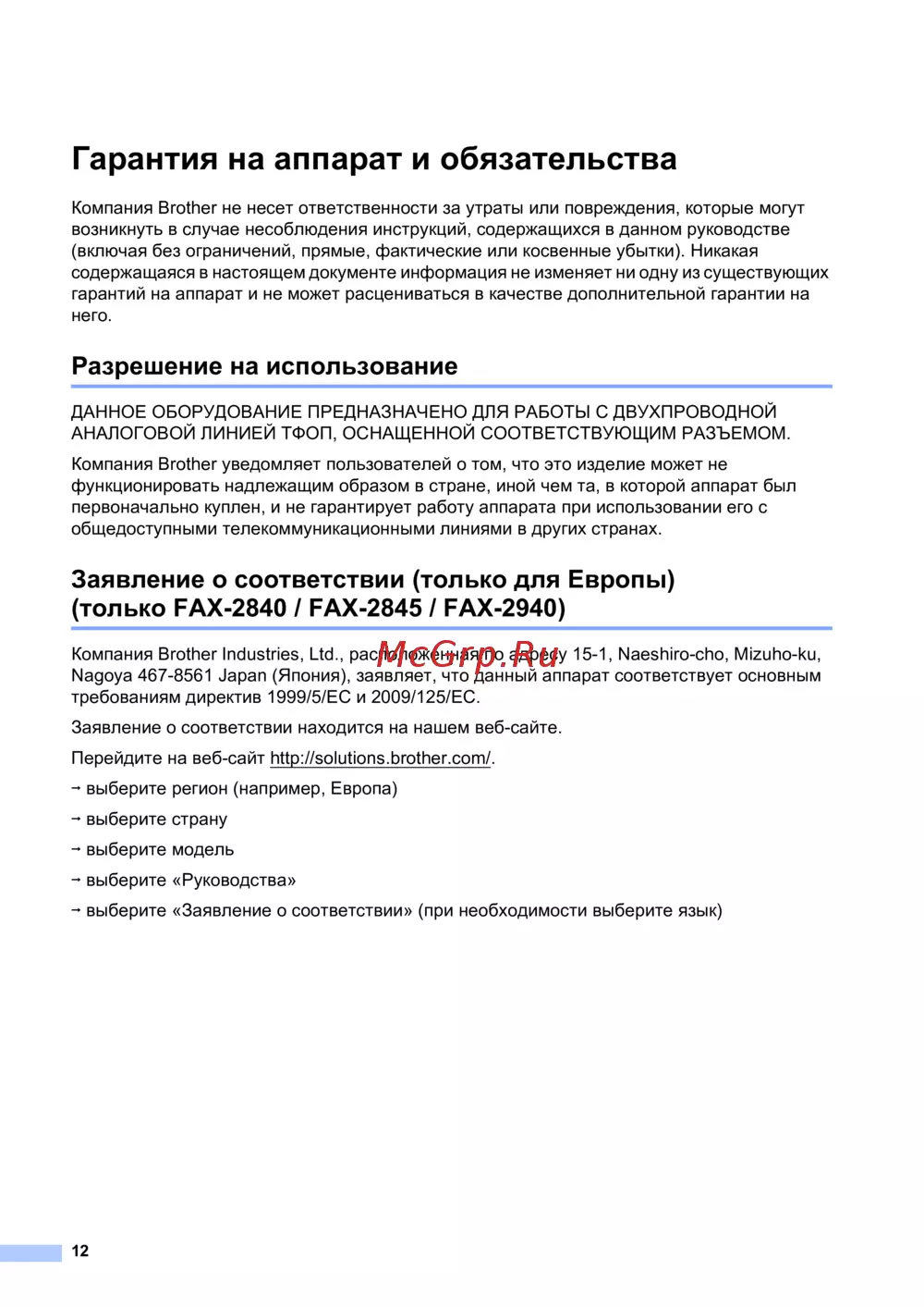 Brother FAX-2840 — гарантия и условия использования оборудования для связи [12/19]