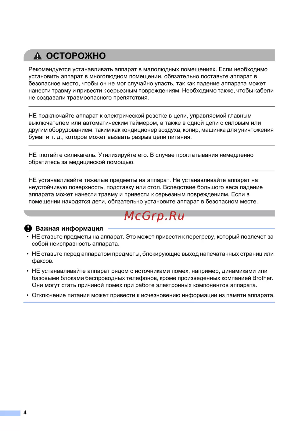 Brother FAX-2840 — безопасная установка и использование аппарата в помещениях [4/19]