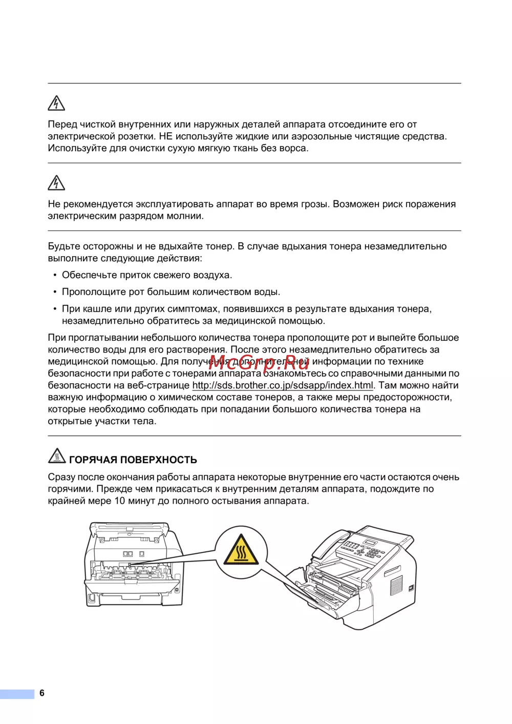 Brother FAX-2840 — правила безопасности при использовании и чистке аппарата [6/19]