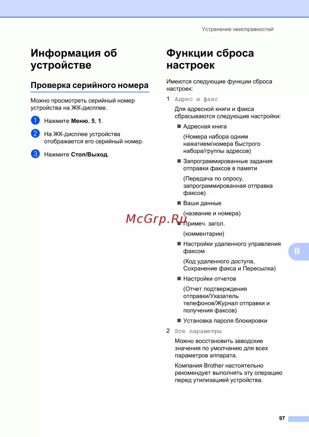 Brother FAX-2845 — устранение неисправностей и сброс настроек устройства [105/127]
