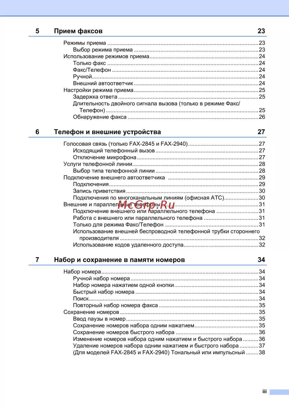 моделей FAX-2845 и FAX-2940) Тональный или импульсный ........38