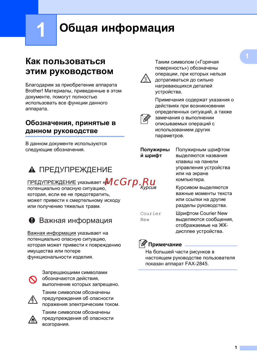 ![Brother FAX-2845 [9/127] Предупреждение](/views2/1406001/page9/bg9.png)