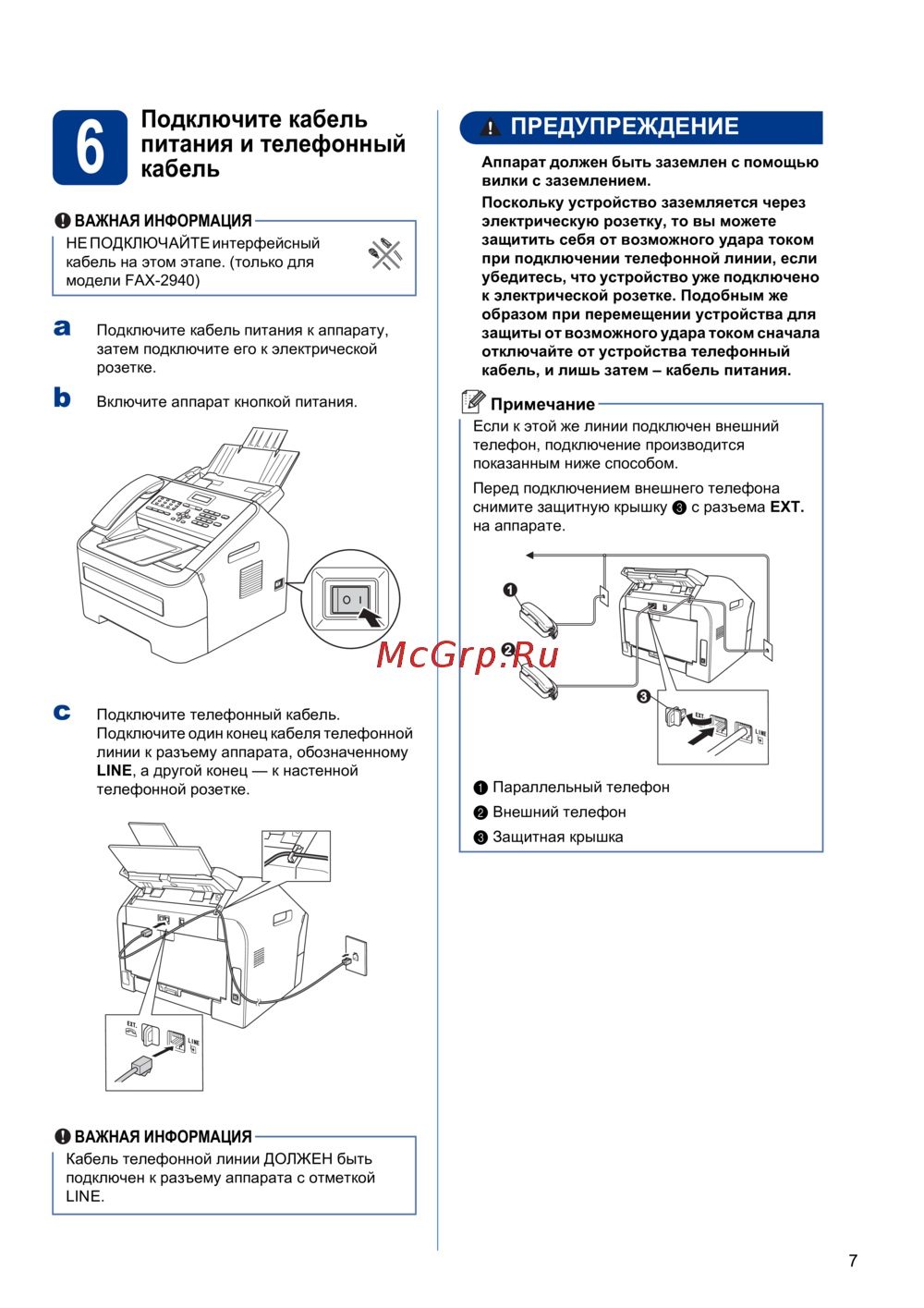 Brother FAX-2845 — инструкция по подключению телефонного аппарата и питания [7/14]