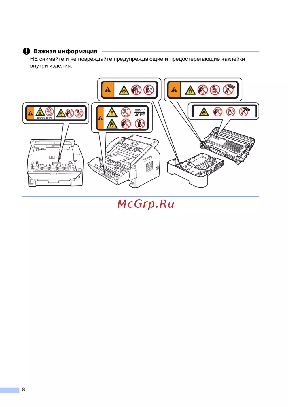 НЕ снимайте и не повреждайте предупреждающие и предостерегающие наклейки