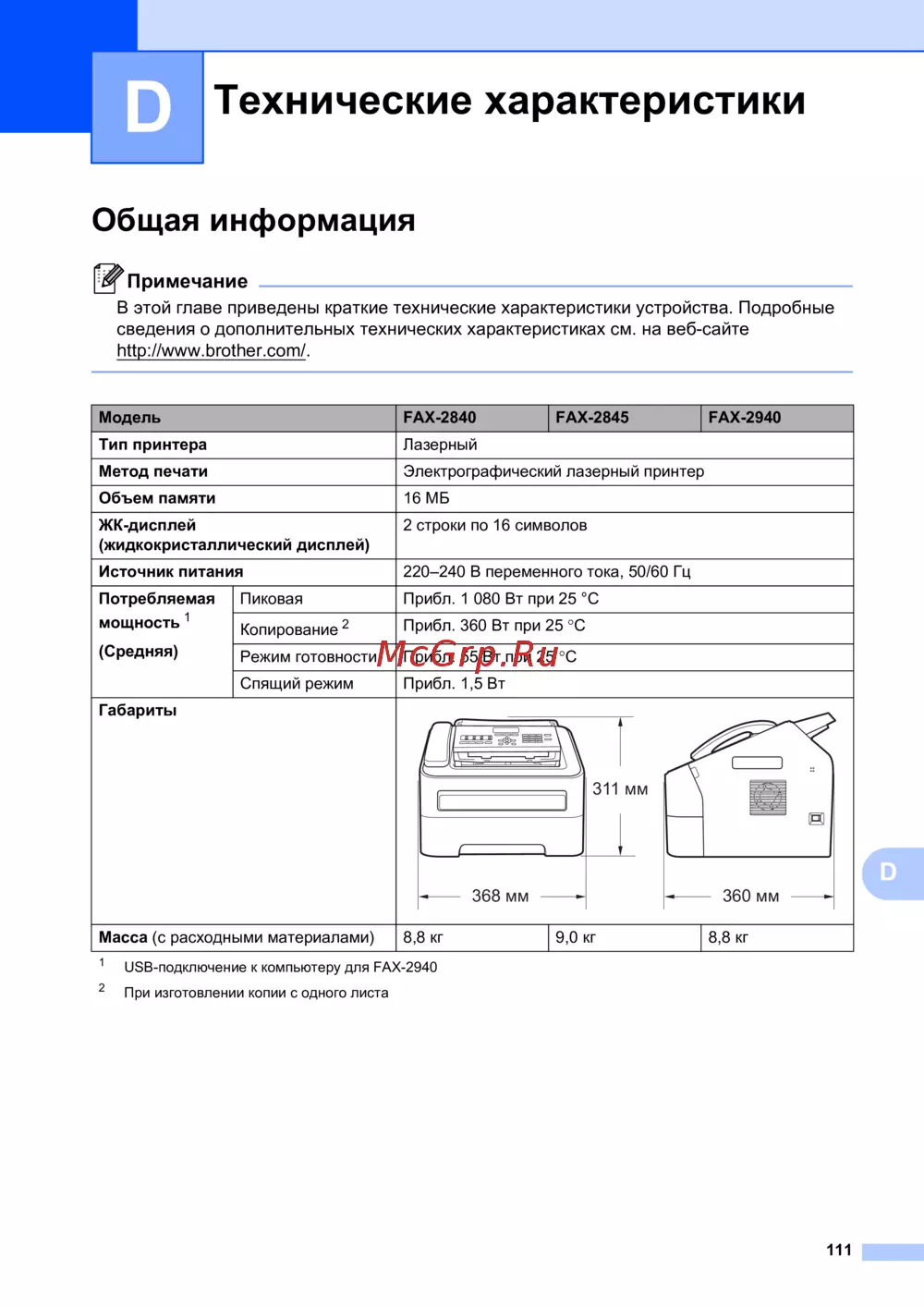 Brother FAX-2940 — технические характеристики лазерных принтеров и факсов [119/127]