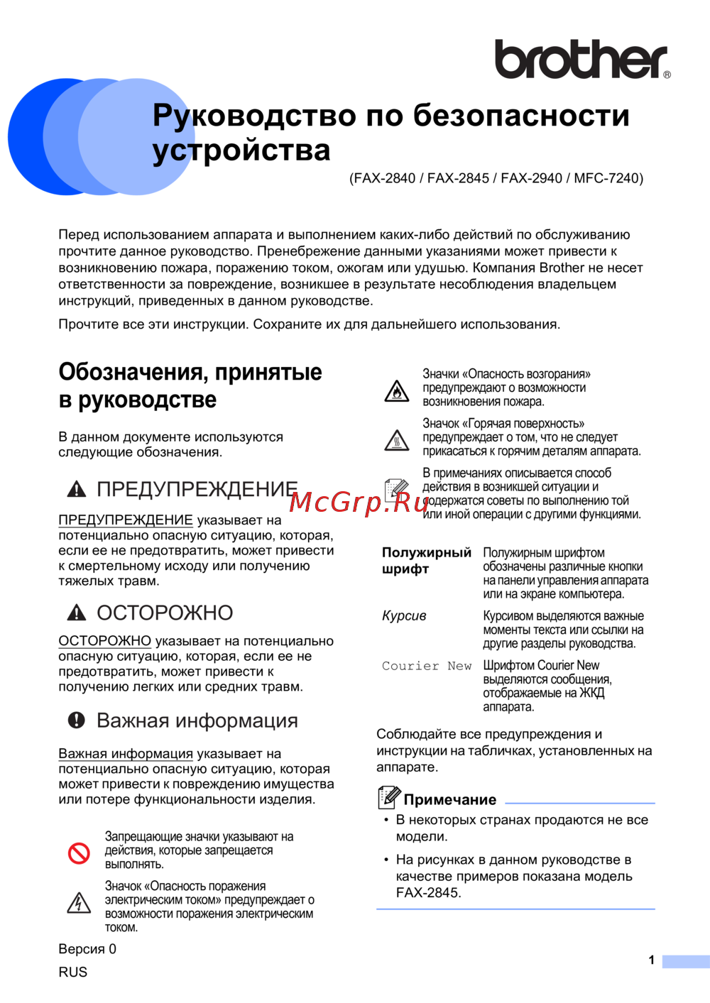 Brother FAX-2940 — руководство по безопасности и обслуживанию устройства [1/19]