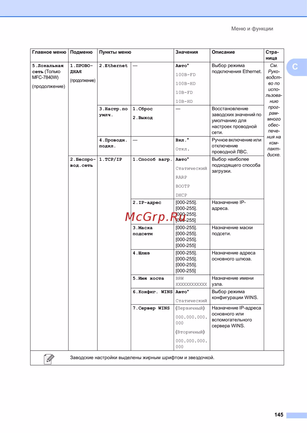 - Проводная сеть ethernet mfc 7440n и mfc 7840w p.172