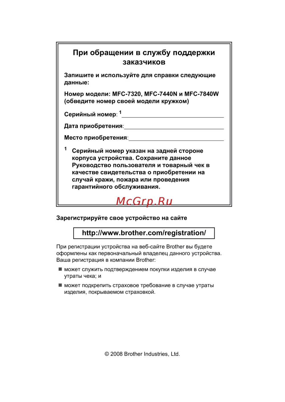 Brother MFC-7440N — информация для регистрации и поддержки устройств [2/187]