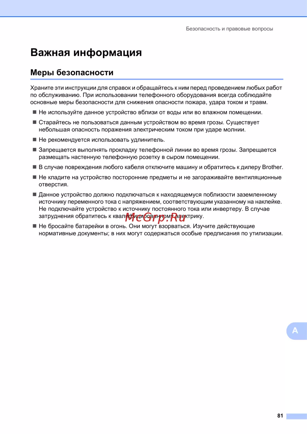 Brother MFC-L8650CDWИнструкции по технике безопасности -