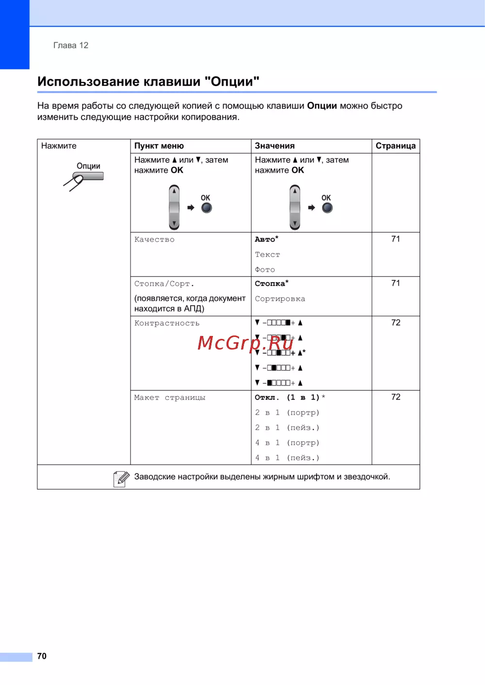 Узнайте, как быстро изменить настройки копирования с помощью клавиши 'Опции'. Настройте качество, макет страницы и другие параметры для оптимизации работы.