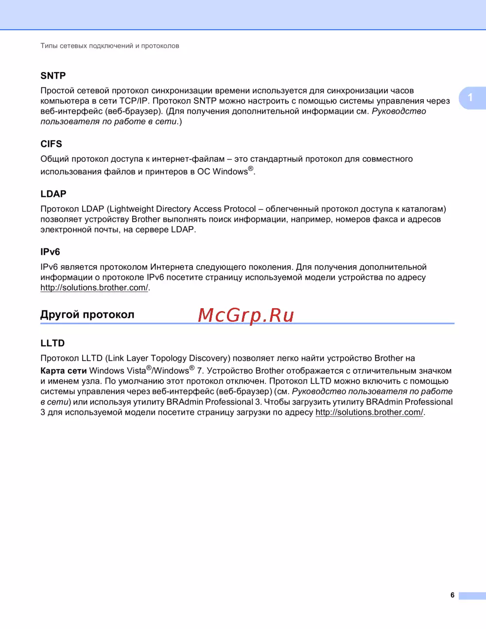 Brother MFC-7460DN — типы сетевых подключений и протоколов для синхронизации и доступа [10/31]