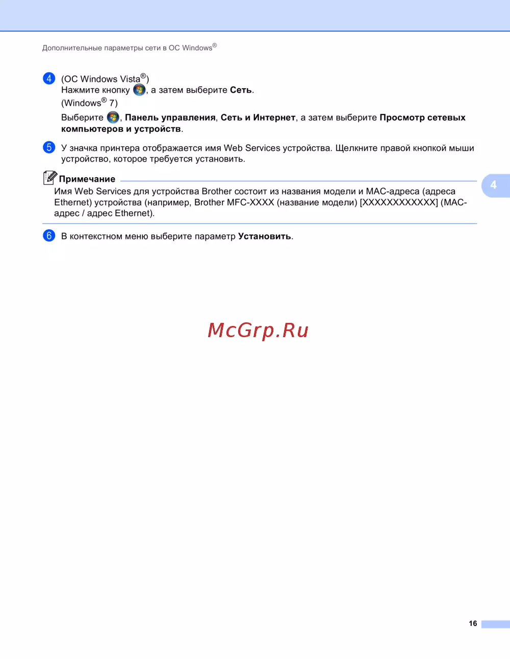 Имя Web Services для устройства Brother состоит из названия модели и MAC-адреса (адреса