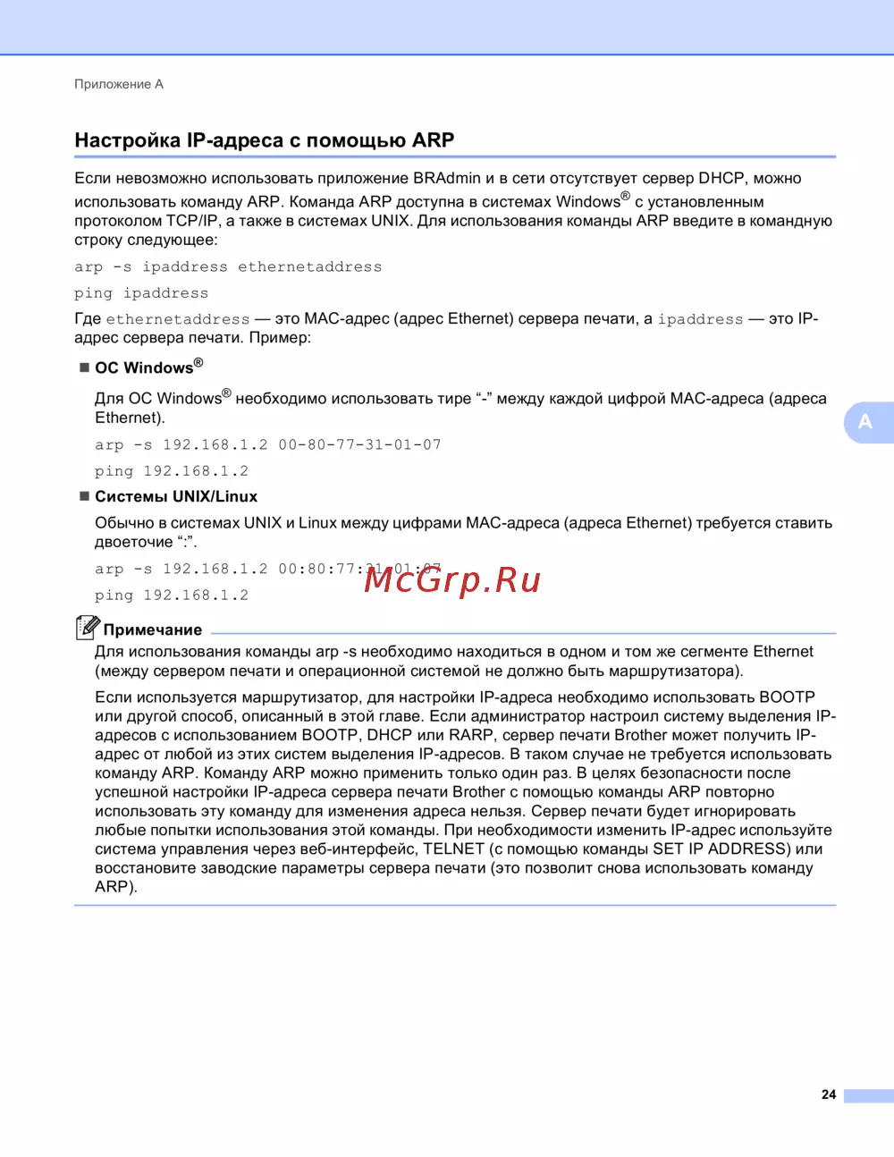 Brother MFC-7460DN — настройка IP-адреса сервера печати с помощью команды ARP [28/31]