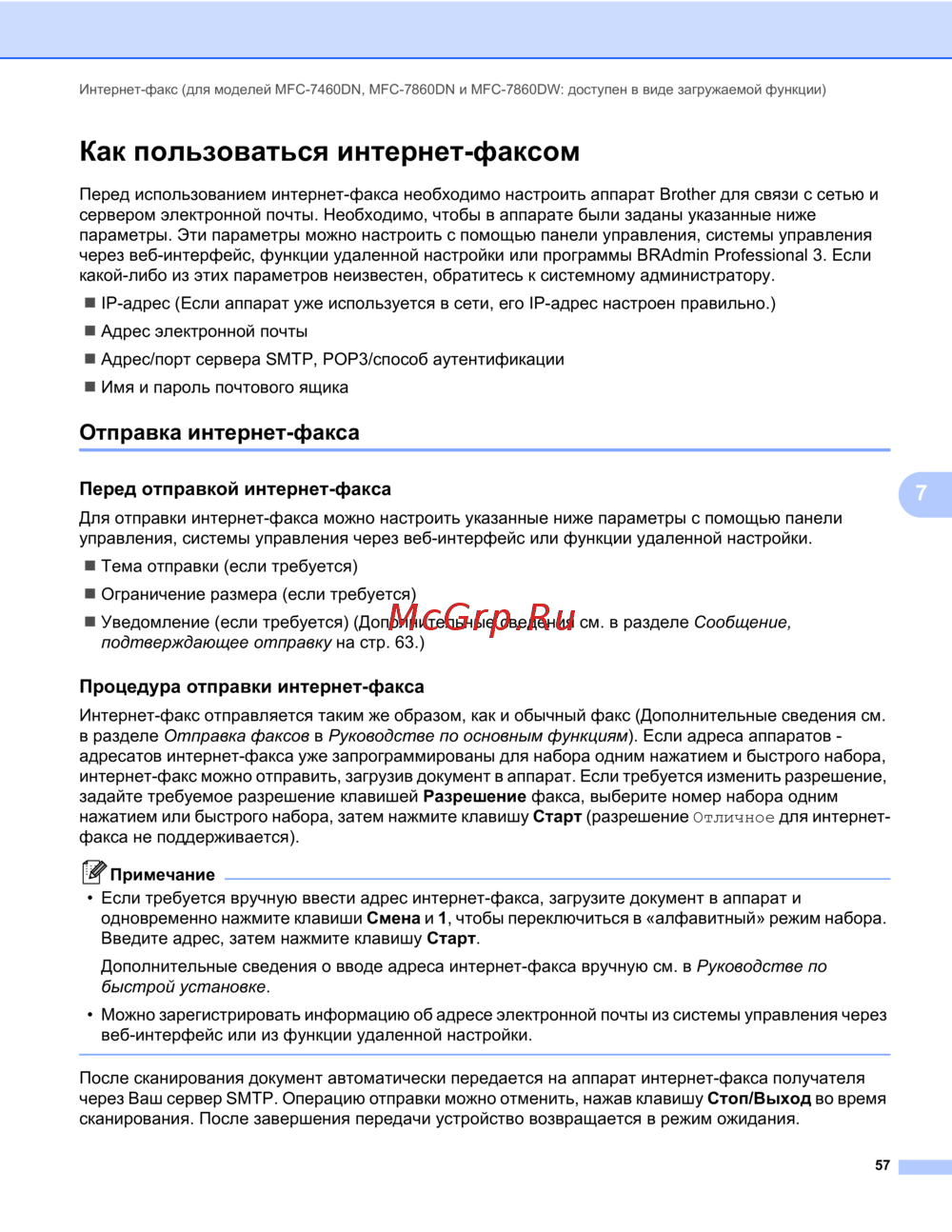 - Интернет факс для моделей mfc 7460dn mfc 7860dn и mfc 7860dw доступен в виде загружаемой функции p.60