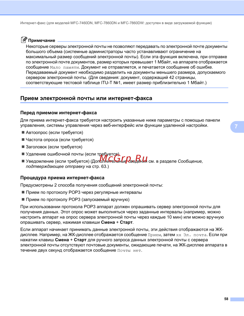 - Интернет факс для моделей mfc 7460dn mfc 7860dn и mfc 7860dw доступен в виде загружаемой функции p.60