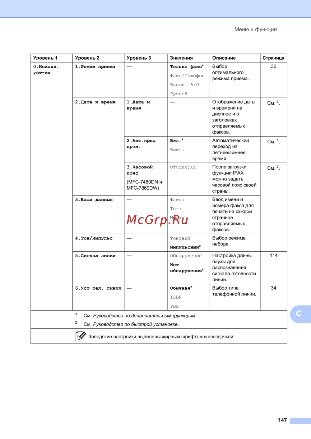 - Заводские настройки выделены полужирным шрифтом и звездочкой p.140