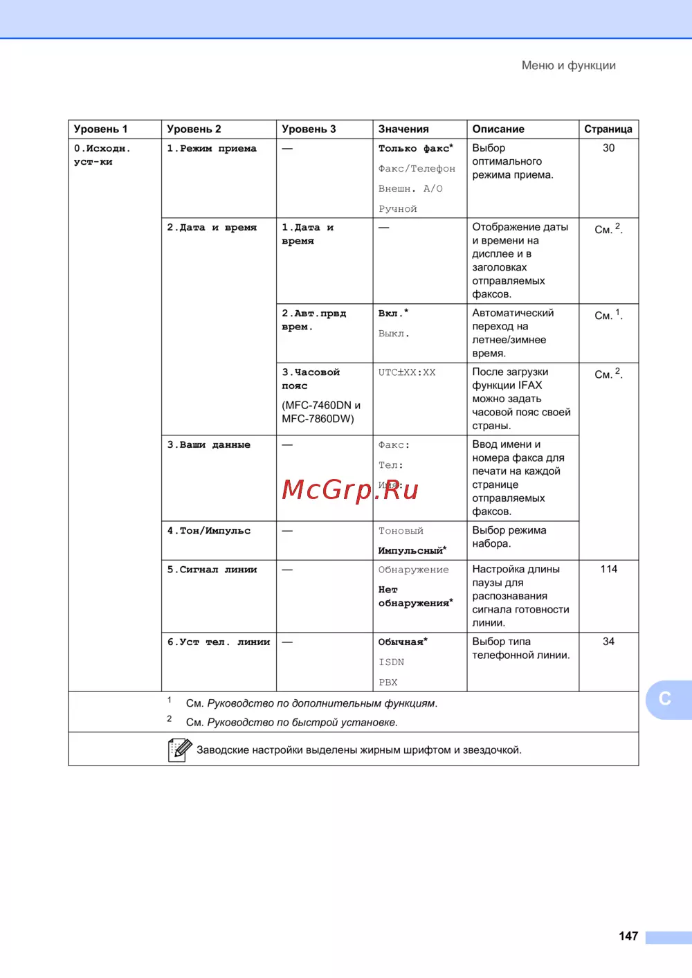 Заводские настройки выделены жирным шрифтом и звездочкой.