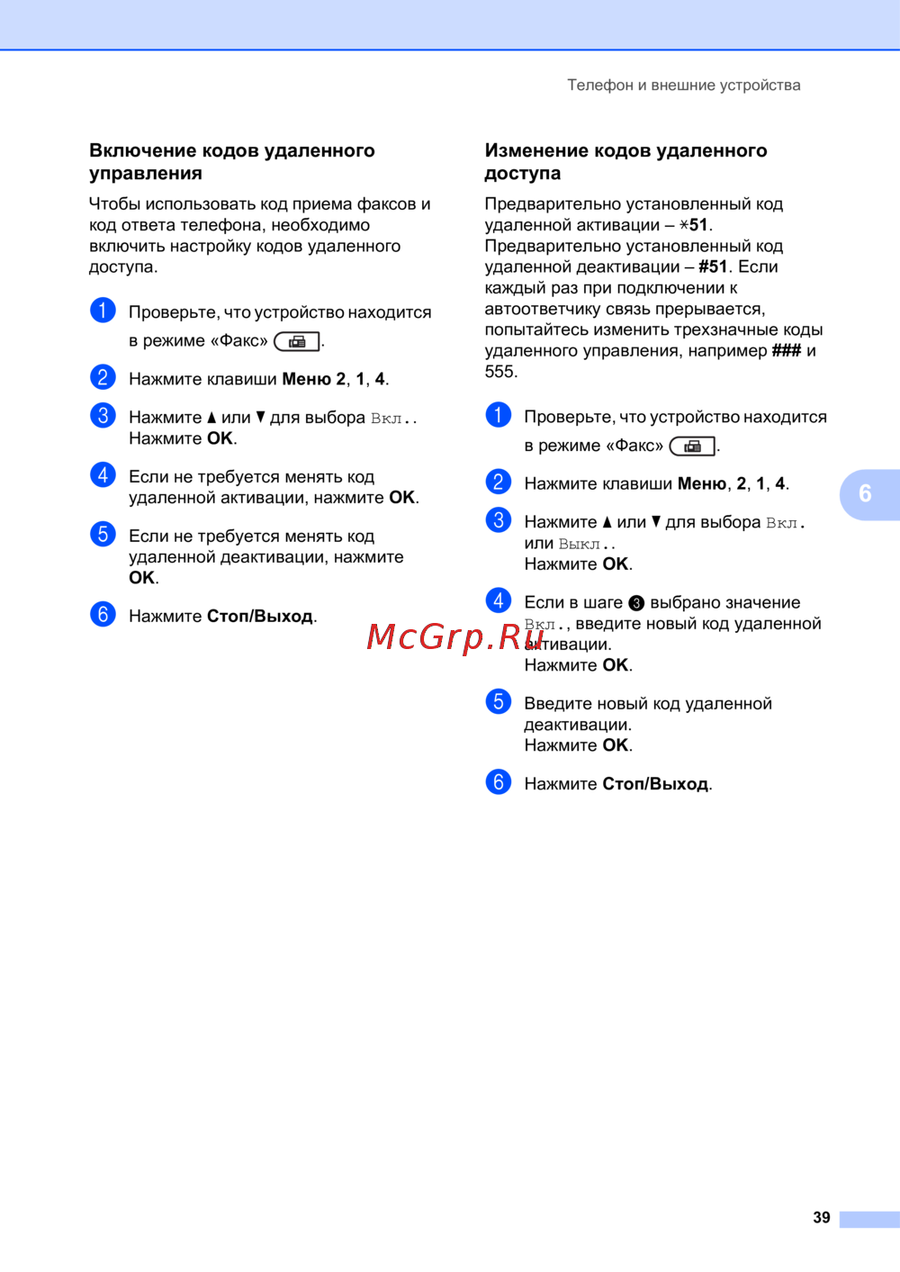 Brother MFC-7460DN — настройка кодов удаленного управления для факсов и телефонов [49/180]