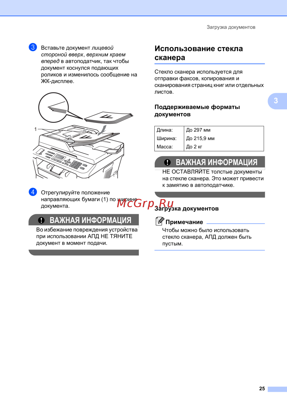 Узнайте, как правильно загружать документы в автоподатчик и использовать стекло сканера. Следуйте рекомендациям для предотвращения повреждений устройства.
