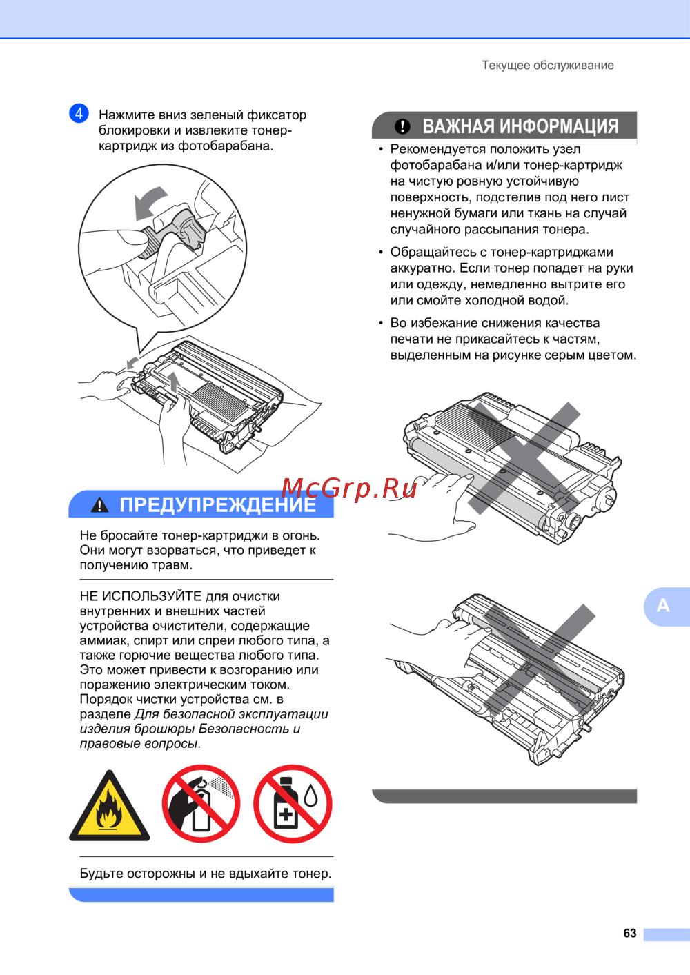 Brother MFC-7860DW — правила безопасного обращения с тонер-картриджами и устройствами [73/180]