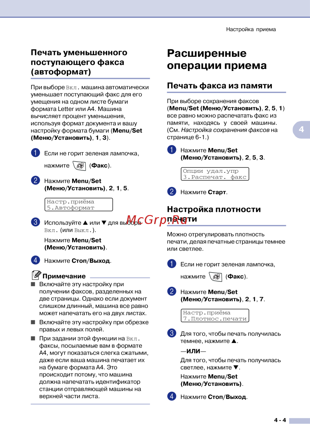 Brother MFC 7420 — настройка приема факсов: автоформат и плотность печати [56/149]