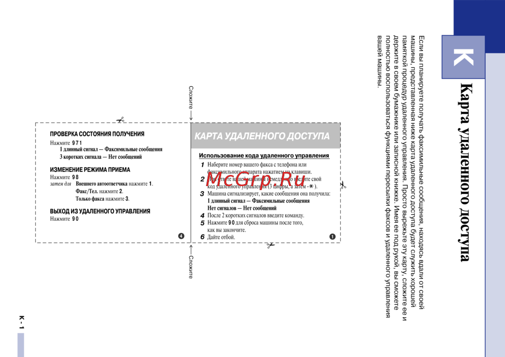 - Если вы планируете получать факсимильные сообщения находясь вдали от своей машины представленная ниже карта удаленного доступа будет служить хорошей памяткой процедур удаленного управления просто вырежьте эту карту сложите ее и держите в своем бумажнике или записной книжке имея ее под рукой вы сможете полностью воспользоваться функциями пересылки факсов и удаленного управления вашей машины p.147