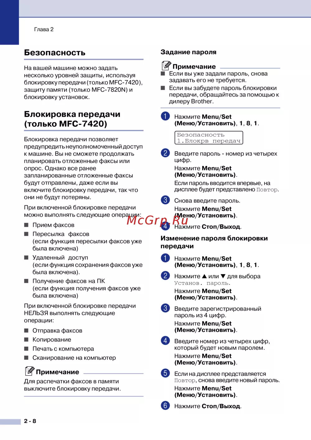 Brother MFC 7820N — уровни безопасности и блокировка передачи на устройстве [35/149]