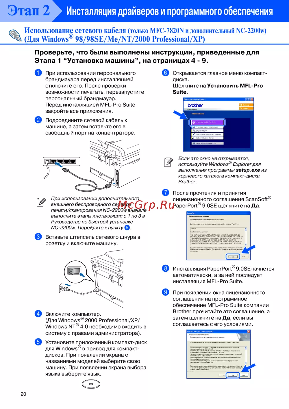 - Использование сетевого кабеля только mfc 7820n и дополнительный nc 2200w для windows 98 98se me nt 2000 professional xp p.22
