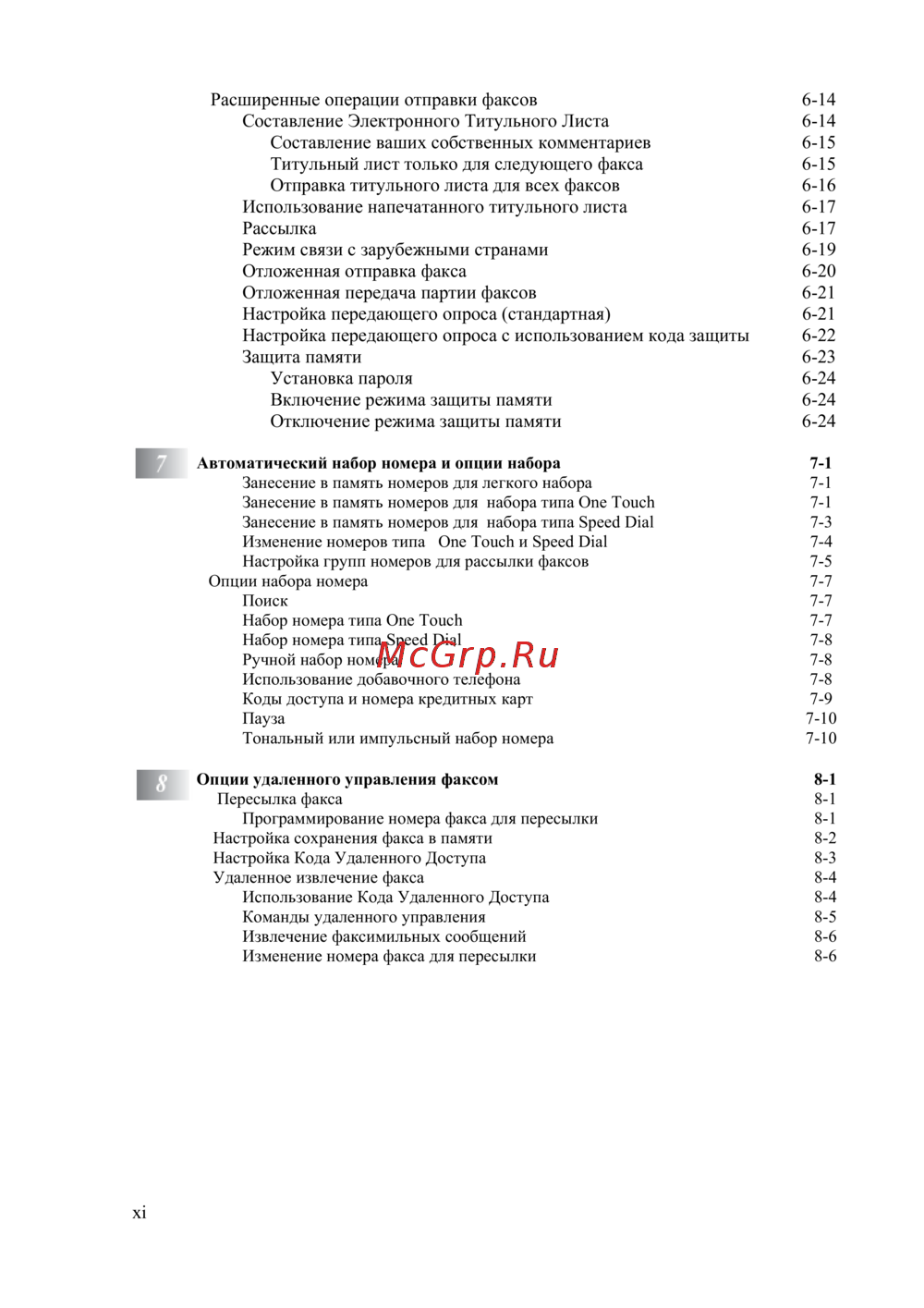 - Расширенные операции отправки факсов 6 14 составление электронного титульного листа 6 14 составление ваших собственных комментариев 6 15 титульный лист только для следующего факса 6 15 отправка титульного листа для всех факсов 6 16 использование напечатанного титульного листа 6 17 рассылка 6 17 режим связи с зарубежными странами 6 19 отложенная отправка факса 6 20 отложенная передача партии факсов 6 21 настройка передающего опроса стандартная 6 21 настройка передающего опроса с использованием кода защиты 6 22 защита памяти 6 23 установка пароля 6 24 включение режима защиты памяти 6 24 отключение режима защиты памяти 6 24 p.12