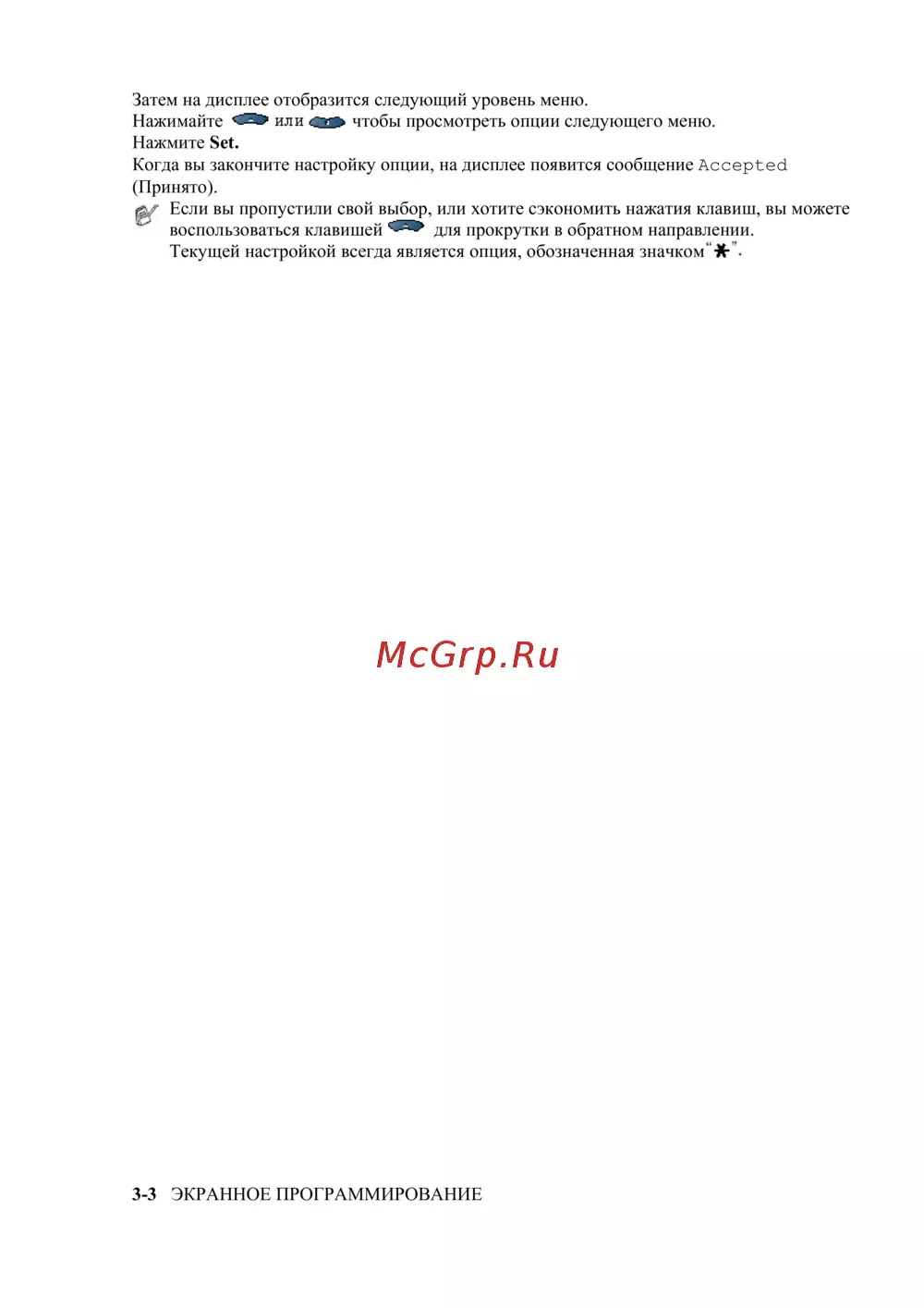 Когда вы закончите настройку опции, на дисплее появится сообщение Accepted