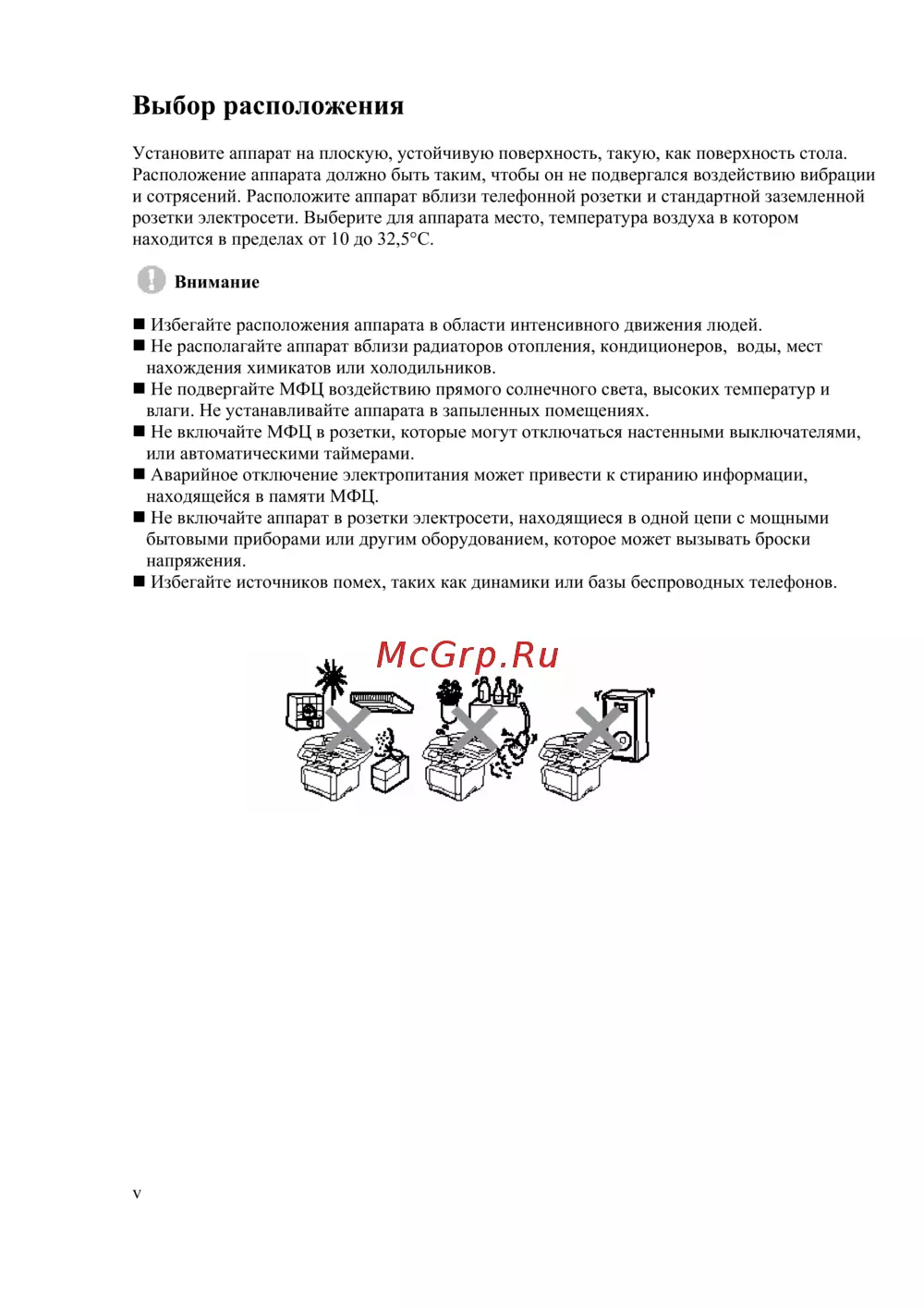 Brother MFC-8420D — рекомендации по установке и расположению аппарата [6/427]