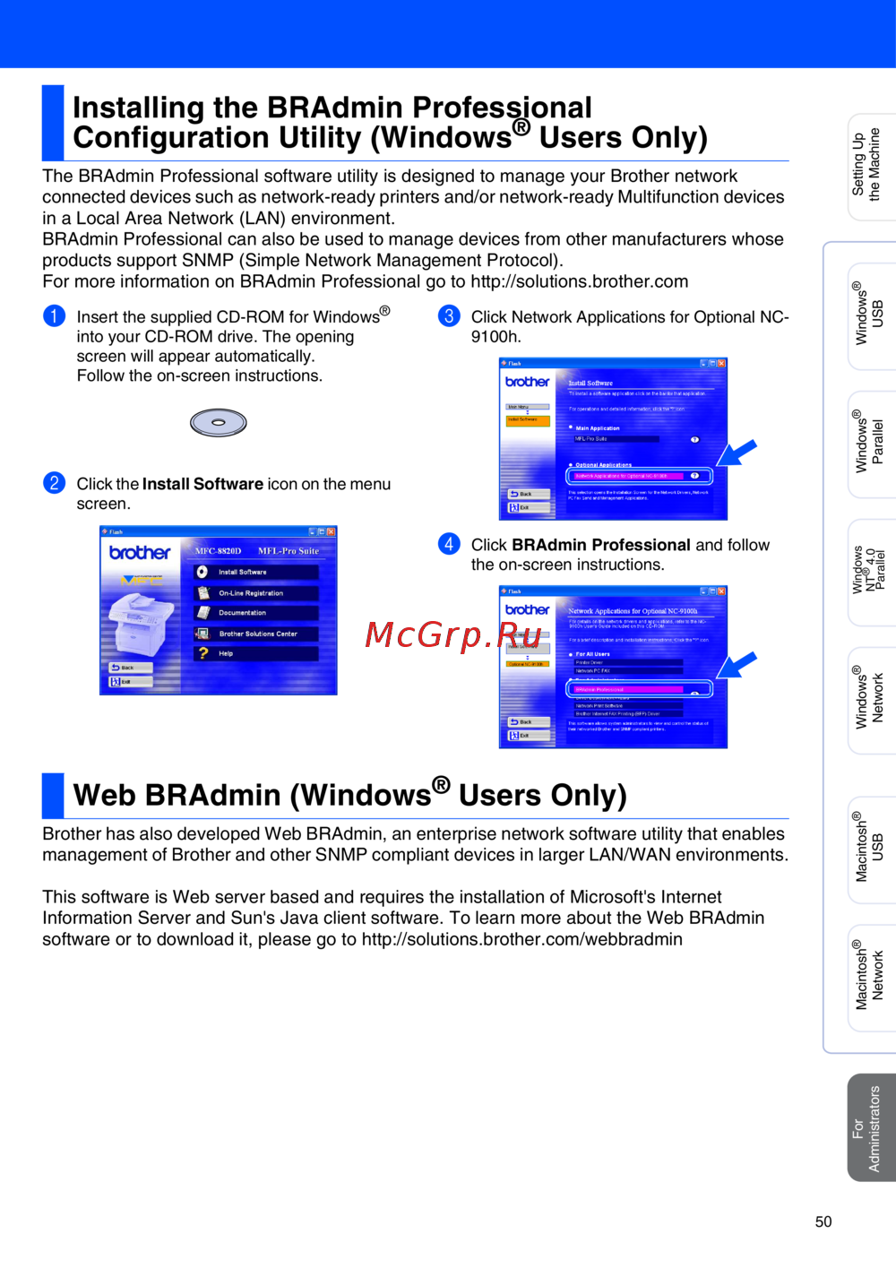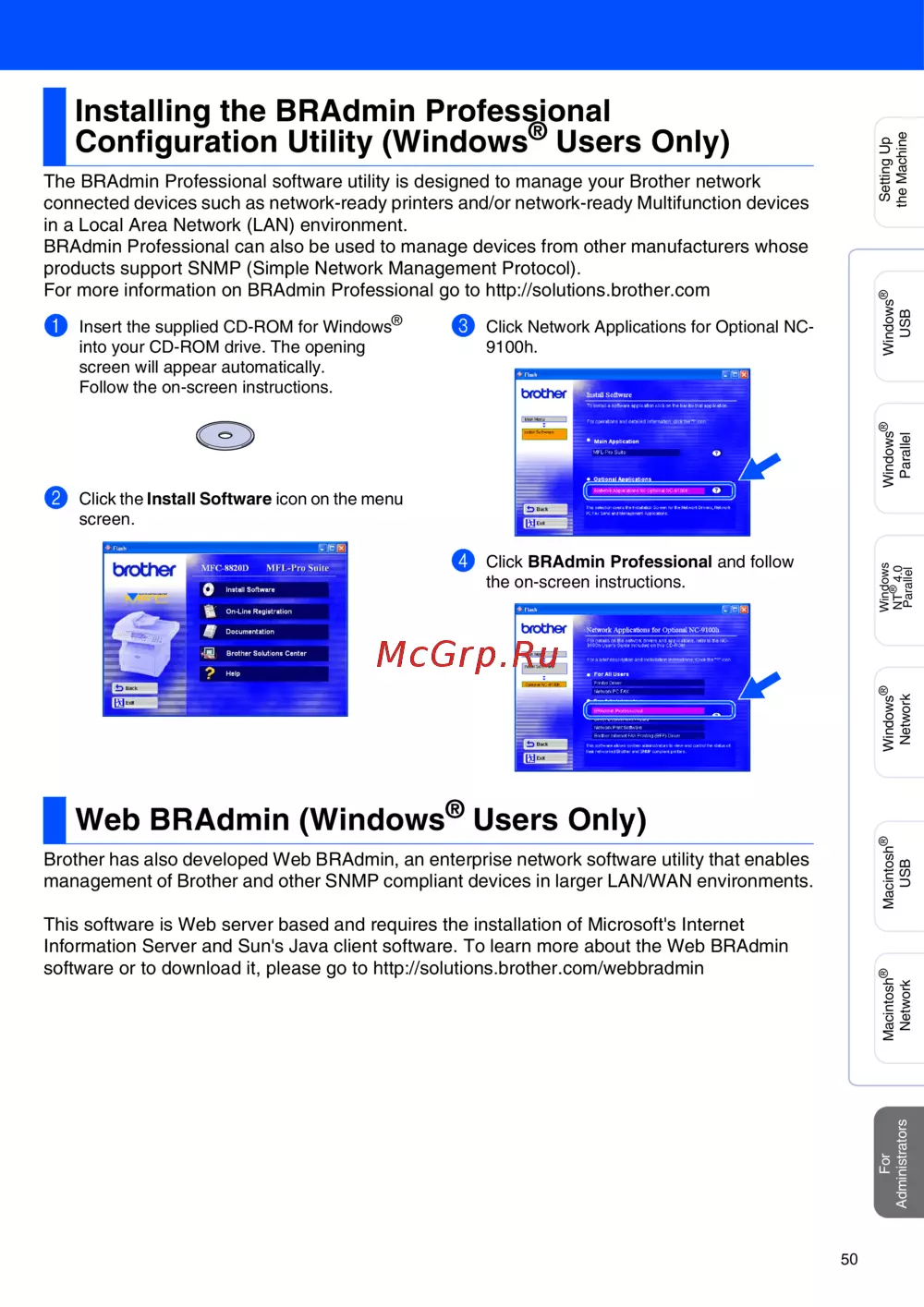 - Brother has also developed web bradmin an enterprise network software utility that enables management of brother and other snmp compliant devices in larger lan wan environments p.53