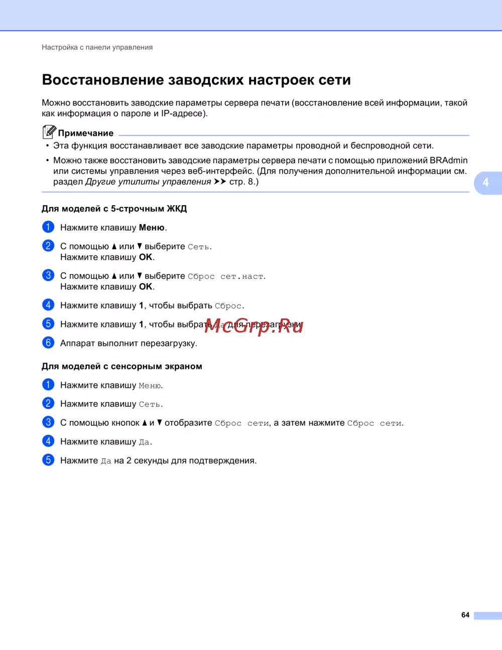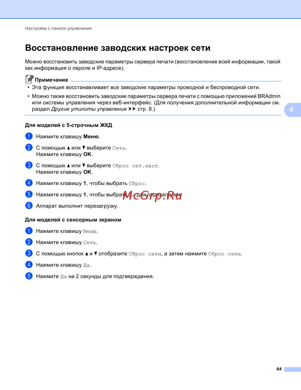 Brother MFC-8510DN — инструкция по восстановлению заводских настроек сети устройства [71/192]