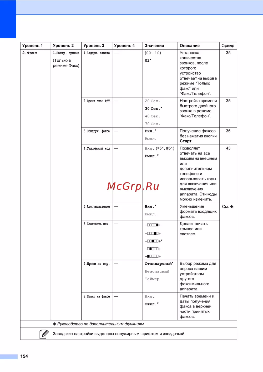 Заводские настройки выделены полужирным шрифтом и звездочкой.