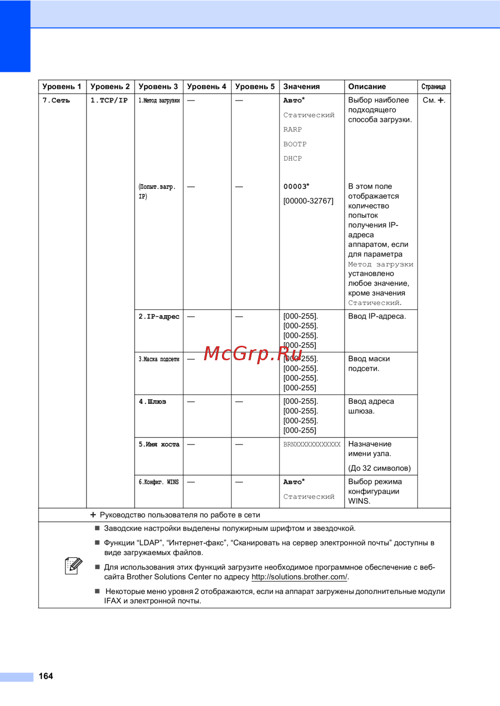 Brother MFC-8510DN — настройка сетевых параметров: IP, маска, шлюз и WINS [174/206]