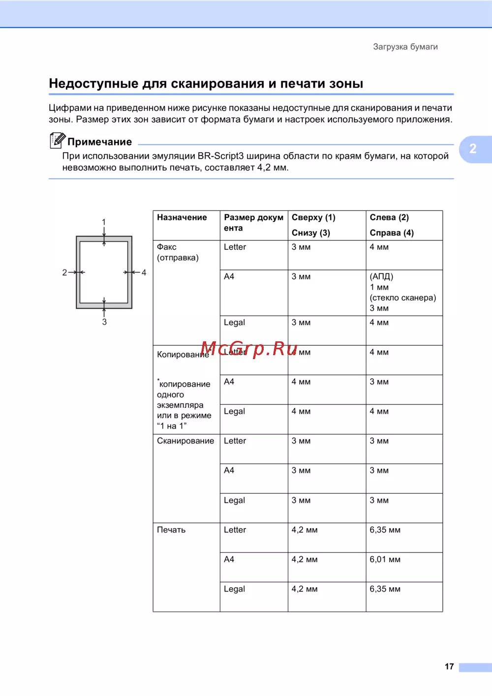 Brother MFC-8510DN [27/206] Цифрами на приведенном ниже рисунке показаны недоступные для сканирования и печати зоны размер этих зон зависит от формата бумаги и настроек используемого приложения