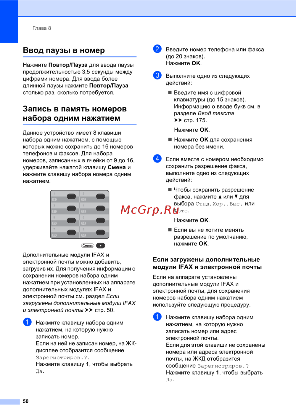 Узнайте, как вводить паузы и сохранять номера телефонов и факсов на устройстве. Пошаговая инструкция по использованию клавиш набора одним нажатием.