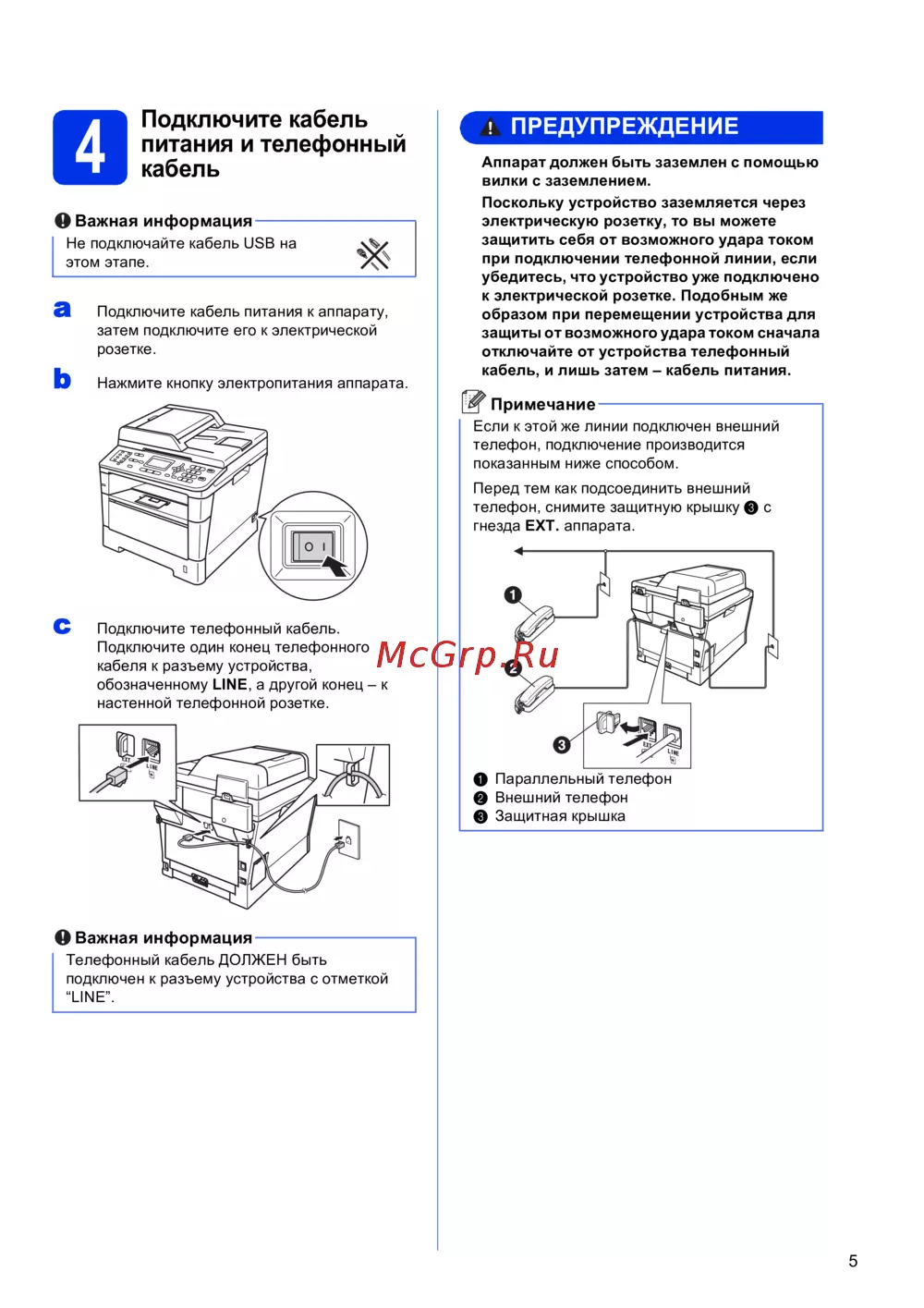 Brother MFC-8510DN — инструкция по подключению питания и телефонного кабеля устройства [5/24]
