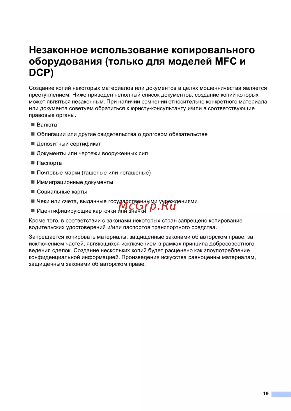 - Незаконное использование копировального оборудования только для моделей mfc и dcp p.19