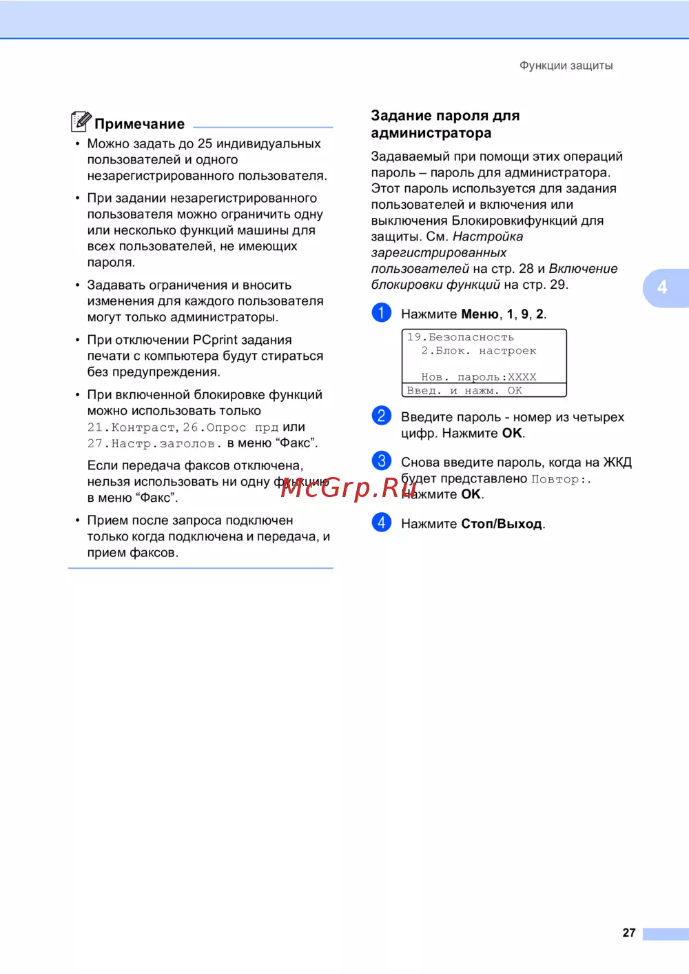 Brother MFC-8870DW — функции защиты и настройки пользователей для администраторов [37/191]